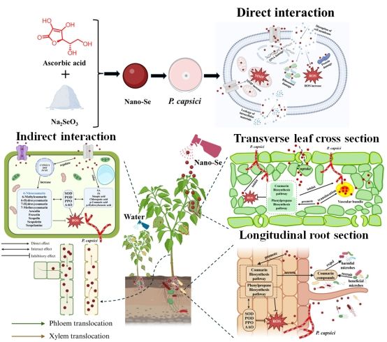 纳米硒(nano-Se)直接导致辣椒疫霉菌丝体的过氧化损伤,导致细胞渗漏、生物代谢抑制进而细胞死亡。辣椒植株中nano-Se的双向传导增强其抗氧化能力。同时调节香豆素和苯丙烷的生物合成途径,增加次级代谢物香豆素(6-硝基香豆素、6-羟基香豆素)、植物激素(JA、SA)和酚酸(阿魏酸、芥子酸)的含量,其中6-硝基香豆素(10 mg/L)通过氧化还原动态平衡和次级代谢的双重调节显示出其对辣椒疫霉的抑制作用。