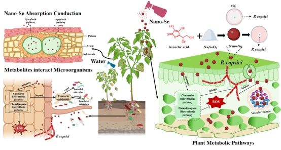 纳米硒重塑了根际微生物群落和结构,丰富了对植株有益的微生物群落,通过将香豆素介导的活性物质与微生物群落相结合,提高了辣椒对辣椒疫霉的抗性。该研究为解决土传病害和化学农药的环境危害问题提供了新的思路。