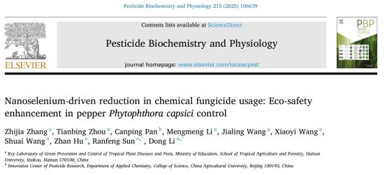该成果以“Nanoselenium-driven reduction in chemical fungicide usage: Eco-safety enhancement in pepper Phytophthora capsici control”为题发表在Pesticide Biochemistry and Physiology期刊(中科院一区,IF=4.0)上,申博SUNBET张芷嘉(2022级植物保护学硕,2025级作物学博士)为该论文第一作者,孙然锋教授、李栋副研究员为论文通讯作者。该论文得到中国农业大学潘灿平教授的指导建议。本研究得到了海南省自然科学基金(325QN229)的支持。