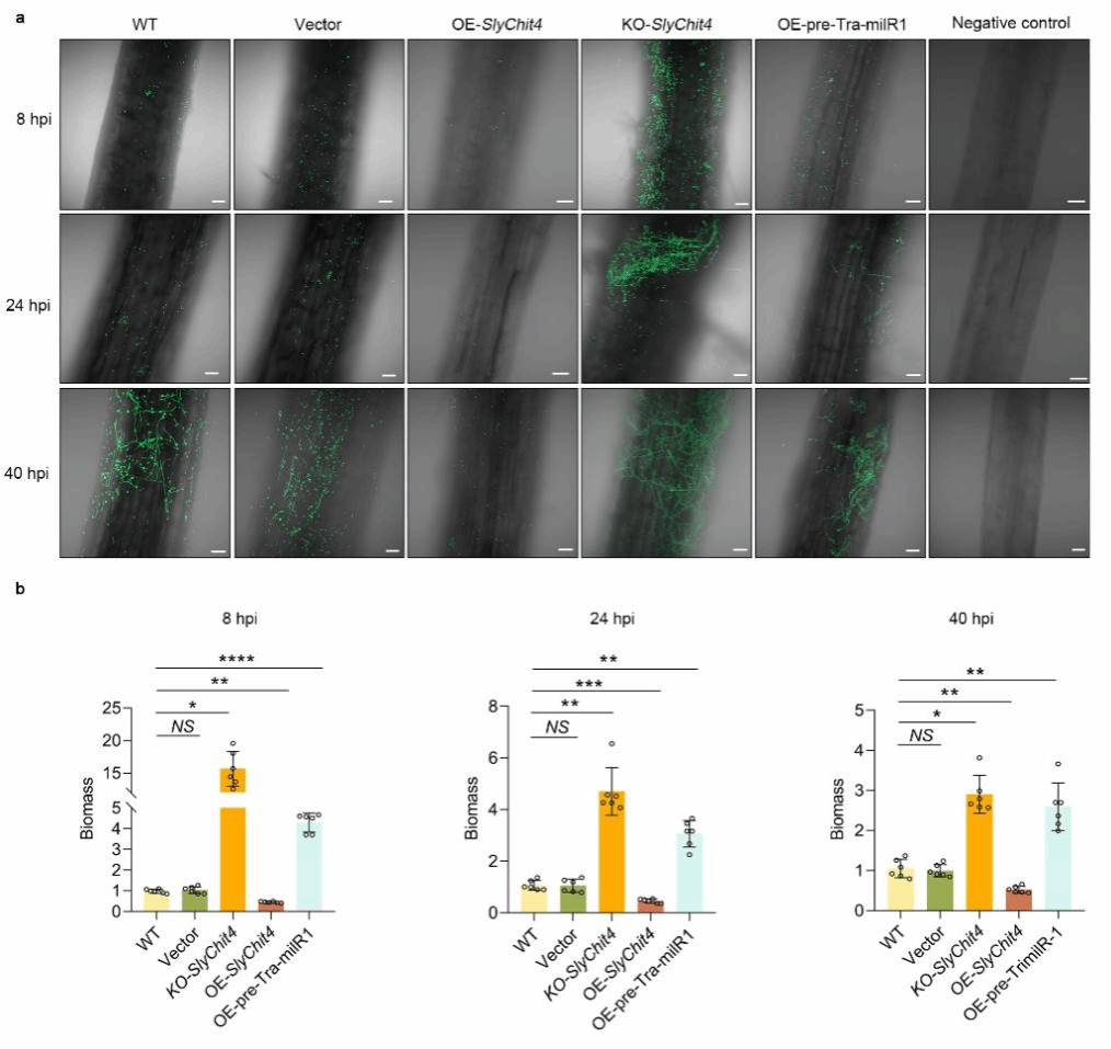 图3. SlyChit4在相互作用的早期阶段抑制木霉菌定植。a:共聚焦显微镜观察显示,在互作过程中,木霉孢子在WT、OE-SlyChit4、KO-SlyChit4和Tra-milR1过表达株系根表面的粘附和生长。b:在互作过程中,木霉在不同番茄根系内定植的生物量。