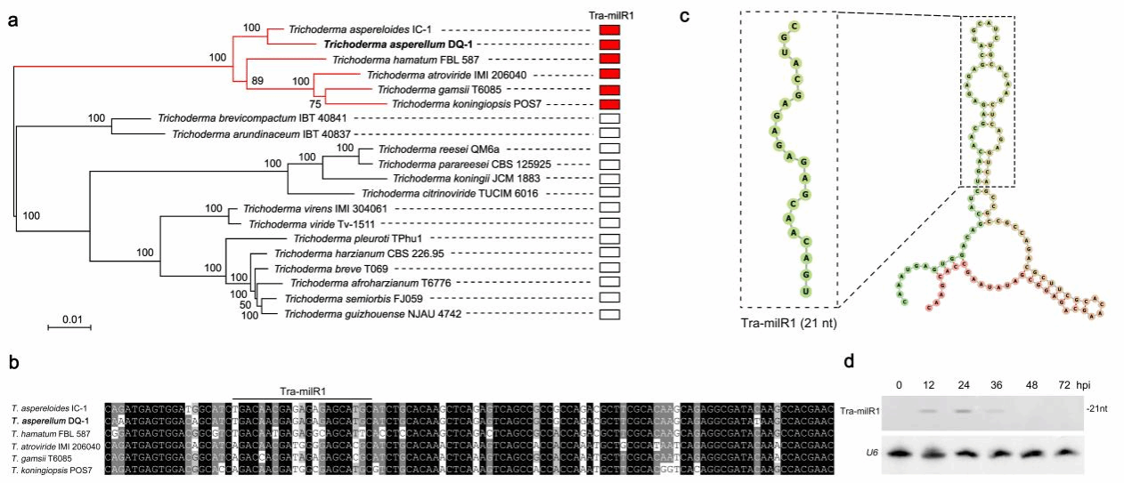 图1. 木霉与番茄互作过程中Tra-milR1的鉴定。a:木霉全基因组水平系统发育树b:木霉前体Tra-milR1的酸序列比对c:前体Tra-milR1的二级结构预测。d:木霉与番茄互作过程中Tra-milR1的Northern blot检测。