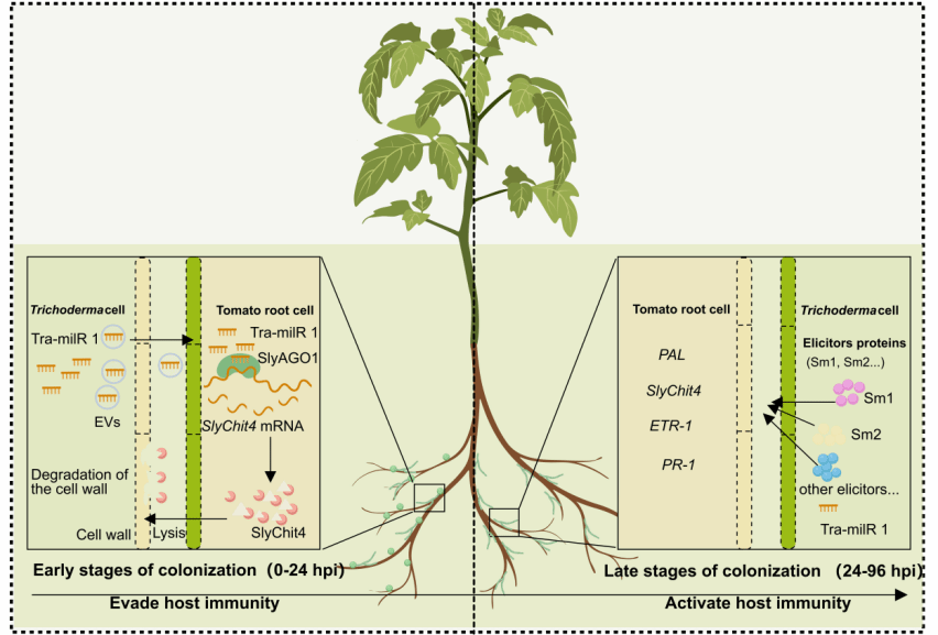 综上所述,该研究揭示了木霉早期通过Tri-miR1进入番茄根部,挟持番茄Ago蛋白SlyAgo1,抑制宿主免疫基因SlyChit4的表达从而抑制番茄免疫,促进了其在宿主根部的定植,并明确了SlyChit4不仅作为免疫相关基因,同时也可以通过降解木霉细胞壁,从而抑制木霉的生长,在定植后期,木霉通过分泌效应蛋白,从而激活番茄的免疫基因表达(图4)。该研究增进了木霉作为生防菌早期逃避宿主免疫机制的理解,也为真菌milRNA的农业可持续应用提供了新思路。