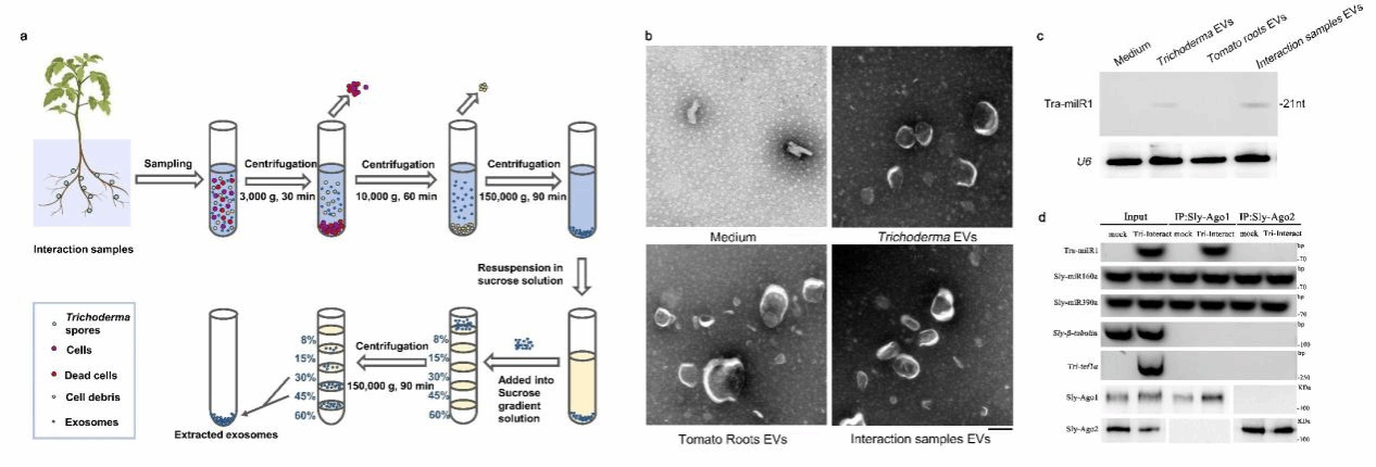 图2. 棘孢木霉DQ-1通过细胞外囊泡(EVs)将Tra-milR1分泌到番茄中,并在相互作用过程中通过与SlyAGO1结合劫持宿主RNAi机制。a:外泌体提取方法。b:EVs的透射电子显微镜图像,比例尺为200 nm。c:提取的EV中Tra-milR1的Northern blot分析。d:互作过程中SlyAgo1、SlyAgo2的免疫沉淀。