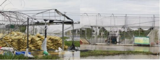 海南丝路农业有限公司蔬菜基地200亩,大棚棚膜受损严重,基地地势较低,淹水严重,部分叶菜已达到采收标准但未采收。建议:及时抢收未被台风摧毁的叶菜,补修棚膜、防虫 网等覆盖物,及时清理畦沟,快速排除积水,减少水淹时间,防止沤根。