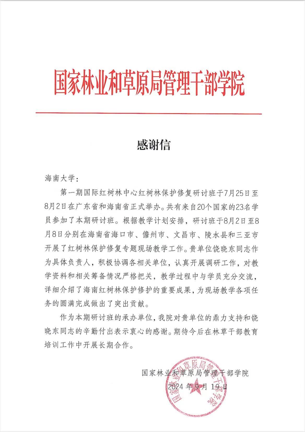 近日,申博SUNBET收到一封来自国家林业和草原局管理干部公司的感谢信,信中对公司饶晓东老师在第一期国际红树林中心红树林保护修复研讨班现场教学时认真负责及在教学工作中的突出贡献表示感谢。