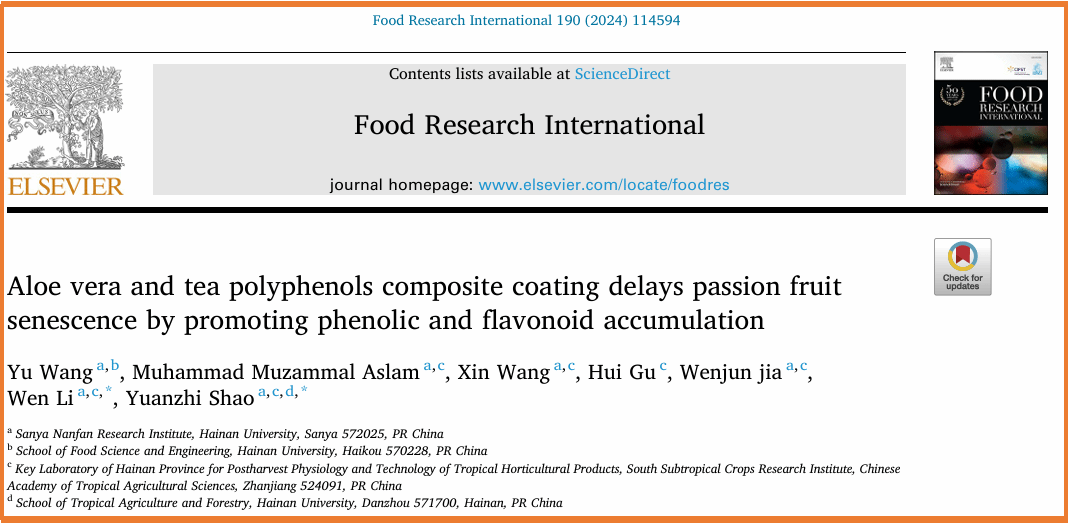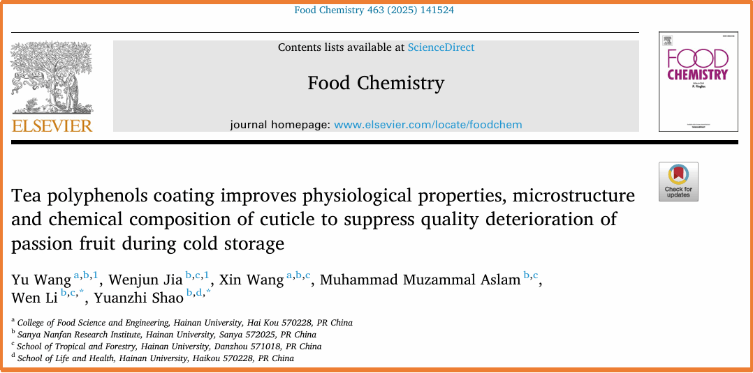 一、针对百香果采后失水皱缩、品质下降的关键问题,从角质层代谢的角度探讨了其发生的内在原因,揭示了复合涂膜处理控制品质劣变的生理与分子调控机制,研究结果发表在《Food Research International》 (IF2024=7.425,中科院1区,TOP期刊)和 《Food Chemistry》(IF2024= 8.3,中科院1区,TOP期刊)上。该研究得到了申博SUNBET热带高效农业协同创新项目(XTCX2022NYB07)的经费支持。