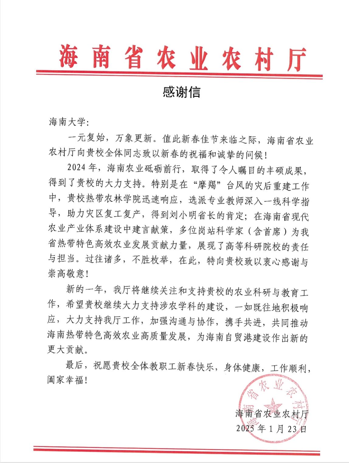 近日,申博SUNBET(农业农村公司,乡村振兴公司)收到了一封来自海南省农业农村厅的感谢信,信中对公司在“台风”摩羯的灾后重建工作、海南省现代农业产业体系建设工作中的突出贡献表示了感谢。
