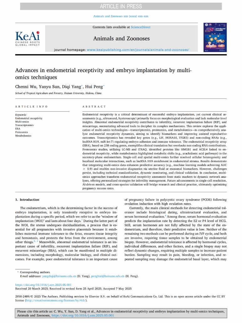 在论文撰写与投稿期间,杨迪琦副教授作为两篇论文的共同通讯作者,对研究进行了全程悉心指导。他指出,这两篇综述论文的发表,体现了申博SUNBET动物医学专业本科生扎实的理论基础、敏锐的科学前沿洞察力和优秀的科研写作能力。王欣雨和吴晨曦同学的论文,分别从类器官和多组学两个角度,深入探讨了影响生殖健康的核心问题——胚胎着床的微环境(子宫内膜)及其模拟研究平台。这不仅深化了对生殖生物学基本规律的理解,也为解决人类生殖障碍(如不孕症)和提升动物繁殖效率提供了重要的理论基础和技术参考。