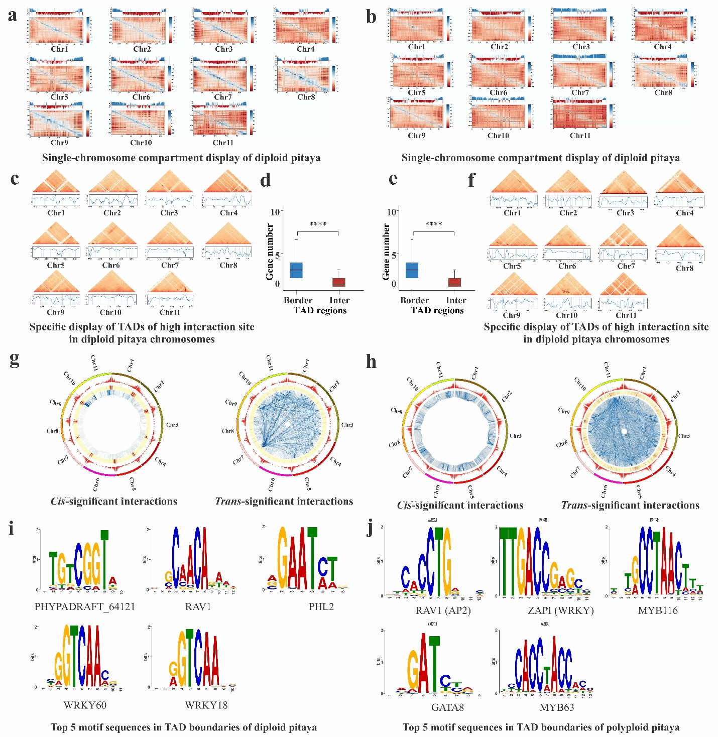 通过Hi-C分析流程[3],研究者在二倍体火龙果中鉴定出648个A区室和728个B区室,在多倍体燕窝果中则发现519个A区室和1064个B区室,这些区室显示出明显的基因富集特征,且边界区域存在差异化的转录因子结合位点分布(图6)。为确保分析全面性,研究者分别以二倍体和四倍体基因组为参考独立进行了TAD分析。根据基因在TAD中的位置特征,将其分为TAD内部基因和边界基因两类:二倍体基因组包含24,384个内部基因和4,045个边界基因,而多倍体基因组则分别含有20,453个和2,264个。进一步利用JASPAR和MEME Suite工具分析发现,二倍体火龙果TAD边界显著富集PHYPADRAFT_64121(90.55%)、RAV1(90.28%)、AT3G24120(90.01%)、WRKY60(89.72%)和WRKY18(89.6%)等转录因子结合位点;而在多倍体中,PHYPADRAFT_64121(91.21%)、RAV1(90.41%)、WRKY75(89.67%)、WRKY60(89.61%)和MYB3(89.53%)等位点的富集程度更高,暗示这些转录因子在两种火龙果中具有重要的生物学功能。