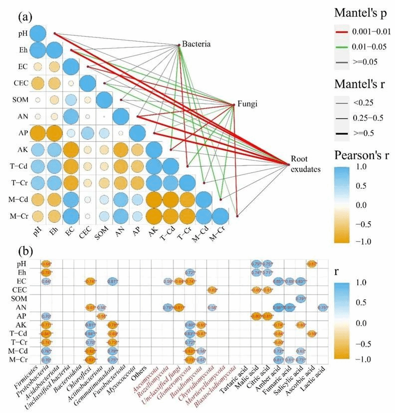 植物修复作为一种绿色修复技术,成为国内外土壤修复关注的焦点。利用螯合剂和微生物增强植物修复成为有效可行的强化修复措施。本研究分别采用高效液相色谱法、Biolog生态板法、荧光定量PCR法和高通量测序法,综合分析了土壤根系分泌物组成、土壤微生物碳源利用、关键基因表达和土壤微生物群落结构的调控作用。[S,S]-乙二胺二琥珀酸(EDDS)的添加可为王草-印度梨形孢(P. indica)共生体系提供良好的根际生态环境,使得土壤pH值降低0.41个单位,刺激琥珀酸和富马酸的分泌,增强氨基酸和碳水化合物的碳源代谢活性,显著提高王草的生物量(25.7%),从而有助于提高Cd/Cr的生物利用度。异化铁还原菌的表达量显著上调99.2%,而梭菌的丰度没有显著变化。此外,土壤根际真菌群落(子囊菌门:45.8%,罗兹菌门:16.7%)的丰富度显著增加,可调节耐受微生物优势类群的比例,增加Cd/Cr去除效率(Cd:23.4%,Cr:18.7%)。这些发现为螯合剂辅助植物-微生物联合修复重金属污染土壤提供理论依据(图1)。
