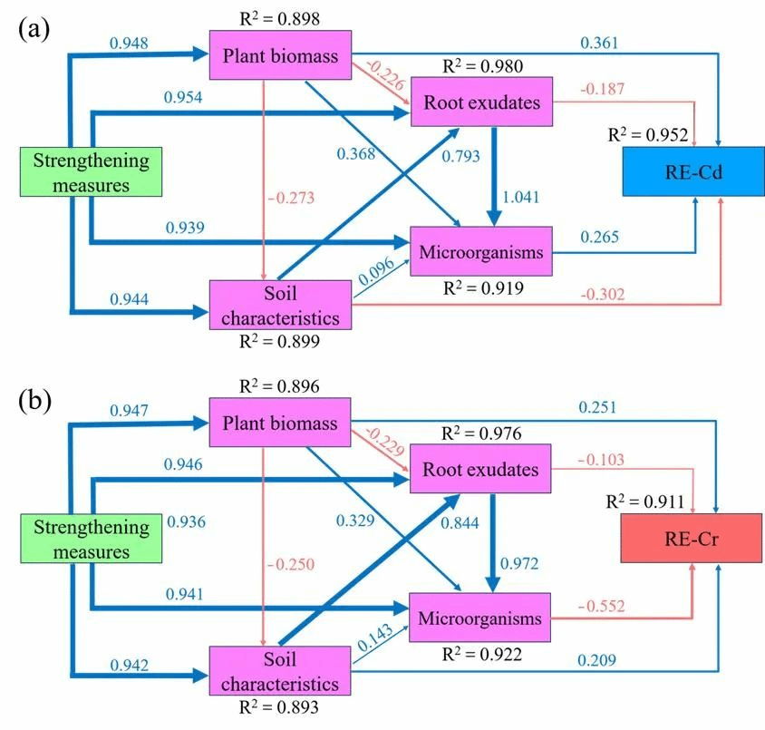 由Spearson相关系数显示,Proteobacteria、Gemmatimonadota、Basidiomycota、琥珀酸和水杨酸与土壤Cd或Cr有效态含量呈显著正相关(P<0.05)(图4)。结构方程模型分析表明,强化措施(EDDS施用和P. indica接种)不仅对Cd和Cr的去除效率有直接影响,还通过刺激植物生长、改变土壤理化性质、影响根系分泌物组成和土壤微生物群落结构来间接影响Cd和Cr的去除效率(图5)。
