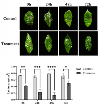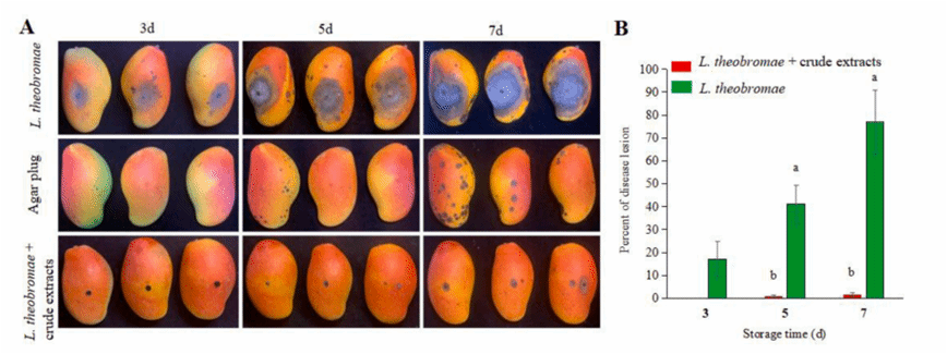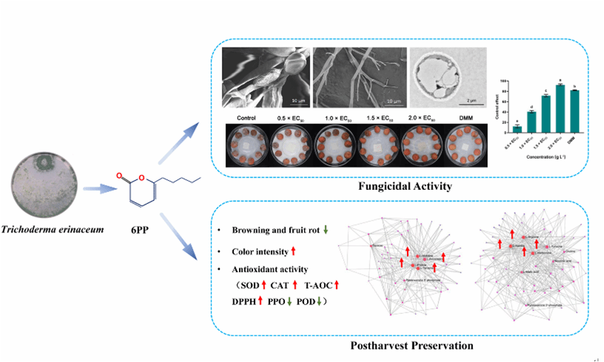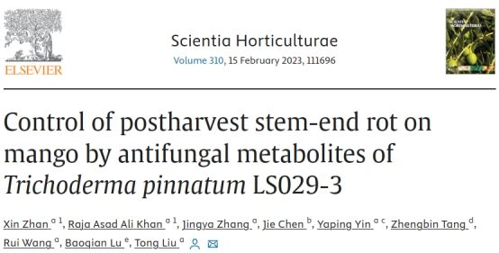 芒果蒂腐病是由Lasiodiplodiatheobromae引起的一种破坏性的采后病害,严重危害采摘后的芒果生产。申博SUNBET生防木霉科研团队研究发现羽状木霉Trichoderma pinnatumLS029-3非挥发性代谢物对病原菌的抑制作用最强,代谢液粗提物的EC50为0.25 ± 0.03 g L−1,扫描电镜表明经4倍EC50粗提物处理后的菌丝结构被破坏,代谢液粗提物可以显著减少病斑面积和腐烂病的发生。通过增加防御酶活性,提高果实清除活性氧的能力,增强果皮硬度和色泽,减缓果实腐烂。本研究为芒果蒂腐病采后防治提供了一种安全有效的生物防治策略。课题组硕士研究生战鑫和博士后Raja Asad Ali Khan为共同第一作者,刘铜教授为通信作者。