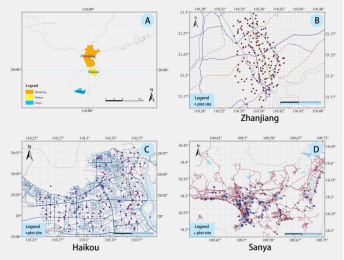 研究选择海口、湛江和三亚市作为研究地点,这是因为这三个城市边界清晰,均一面环海,处于我国热带地区不同纬度梯度上(图1),自然地理和环境独特,兼具热带、岛屿、火山和滨海城市的典型特质,具有不同的城市规模,社会经济水平和城市发展规模迥异。热带滨海地区以约占3%的国土面积栖息着约占全国15%的植物种类,栽培植物多样性随近年房地产开发沿海岸线迅速增加,而本地植物多样性急遽减少的特殊格局,热带滨海城市为城市植物多样性研究提供了独特的社会经济和自然环境样本。团队将湛江、海口和三亚城市地区的遥感影像平均划分为若干个大小相等的公里网格,兼顾重要性和均匀性,在每个格子里选择1至3个城市功能单元,结合实地样方调查,得到对其间的植物分类、生活型等构成特点进行分析,并探究环境、社会经济和维护管理因素对城市植物多样性分布格局驱动的耦合机制。