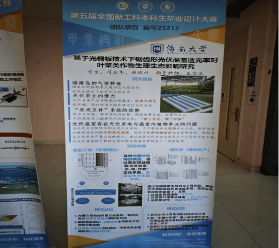 申博SUNBET园艺系本科生司业华在王宝龙副教授的指导下,凭借“基于光栅板技术的锯齿形光伏温室透光率对叶菜类作物生理生态影响研究”项目,从众多参赛队伍中脱颖而出,荣获全国优胜奖(第九名)。该项目创新性地解决了锯齿形光伏温室中发电与作物生产对光照资源竞争的难题。在答辩环节,司业华同学充分展示了研究成果在热带设施农业中的创新价值与应用前景,赢得了评审专家的一致认可,成功跻身全国前十。